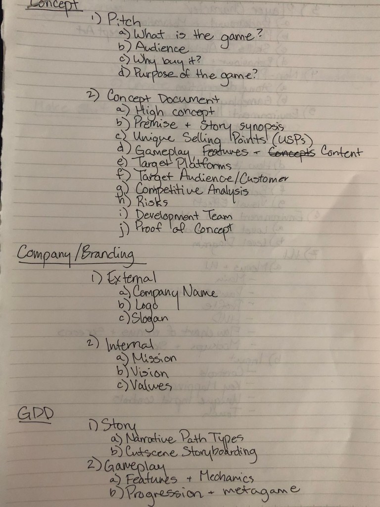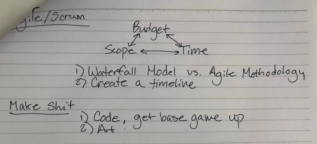 Now that I have somewhere to write and document everything, it’s time to come up with a development plan. I referenced several documents and PowerPoints available to me that I saved from school, specifically a class called Project Management. Essentially, the plan. I need to start off with a strong foundation to make this project a success. Briefly going through and skimming the whole course, I wrote down from start to finish the things that I would need to complete. I find it easier to write things down by hand and reference them than some Word document.
